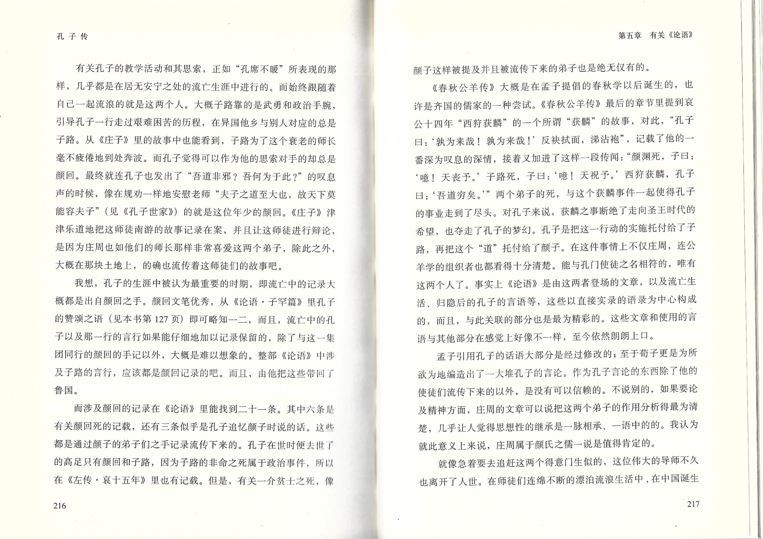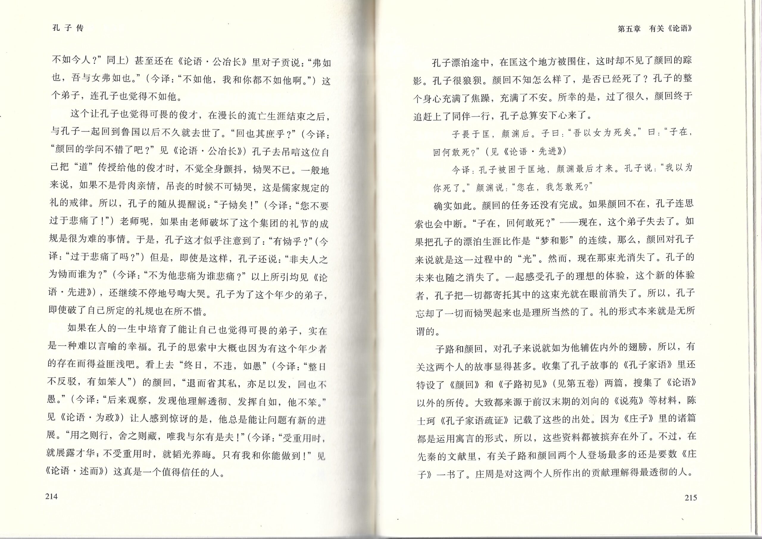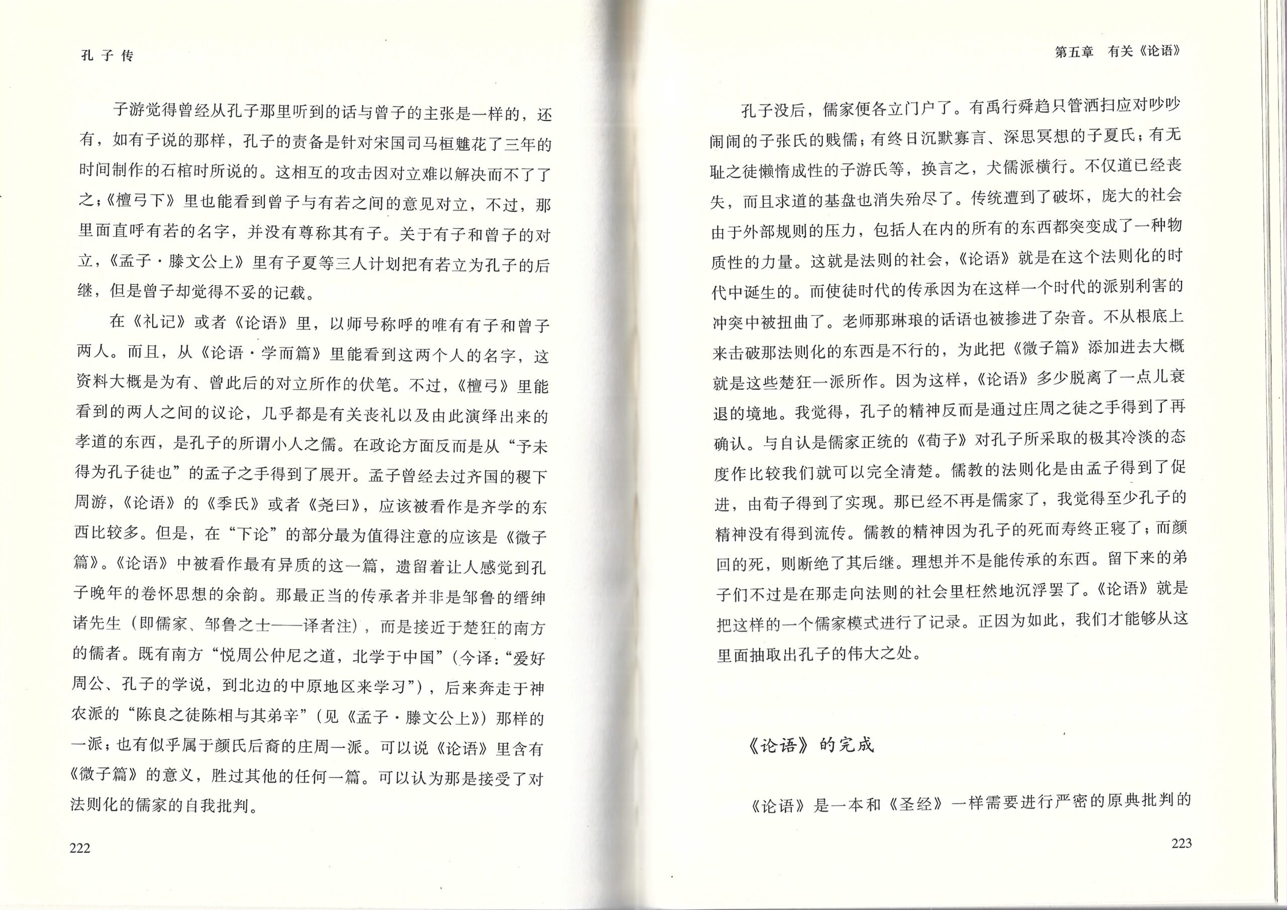 正如作者所总结的:孔子的精神反而是通过庄周之徒之手得到了再确认。与自认是儒家正统的‘荀子’对孔子所采取的极其冷淡的态度做比较我们就可以完全清楚。儒教的法则化是有孟子得到了促进,有荀子得到了实现。那已经不再是儒家了,我觉得至少孔子的精神没有得到流传。儒教的精神因为孔子的死而寿终正寝了;而颜回的死,则断绝了其后继。理想并不是能传承的东西。留下来的弟子们不过是在那走向法则的社会里枉然地沉浮罢了。