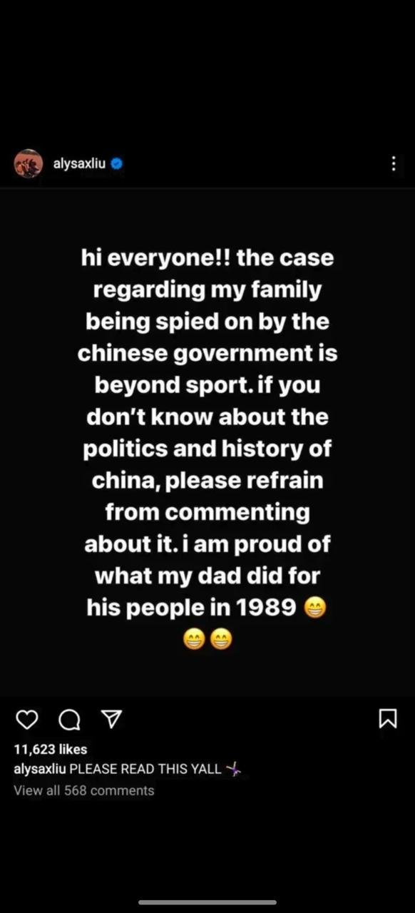 一个是89后代,单亲爸爸培养出来的,屡遭CCP追踪和收买,据说有间谍都打入到她爸爸身边做了朋友,最后承认了身份;依靠自己的努力和坚持,追踪实现了自己的梦想和价值。而且在美国MAGA甚嚣尘上的舆论中能坚持自我、坚持自己的价值观,为美国的多元价值勇敢发声。(以下为早期的instagram帖子)